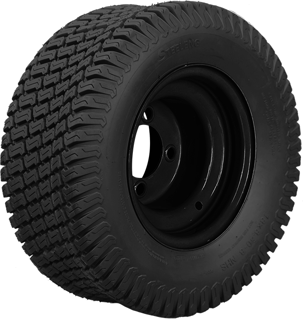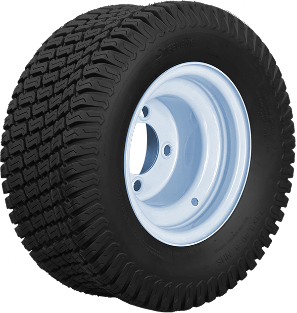 New Steeleng 18×8.5-8 turf wheel and tire for golf cart. Wheel and tire combination, fits all golf carts with 4 hole bolt patterns. Black and white wheel colors available.